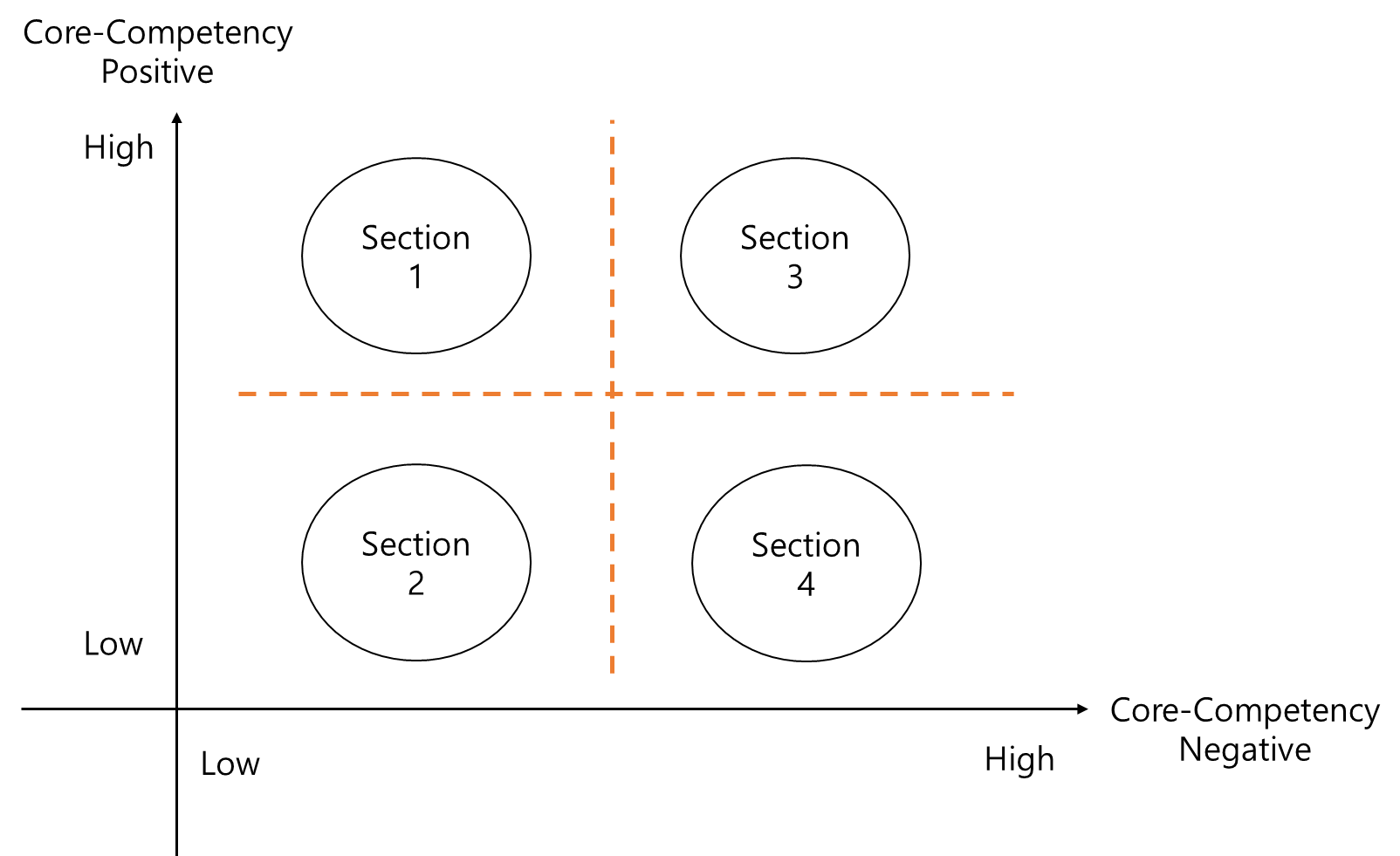 우리가 기존의 고객을 설득하기 위해서는 우선순위의 긍정적, 부정적 요인을 구분하여 가로 X축, 세로 Y축을 그린다. 교차점은 낮은 것이고, 교차점에서 멀어지는 것은 높은 것을 의미한다. 이것을 시각화하면 아래와 같다.