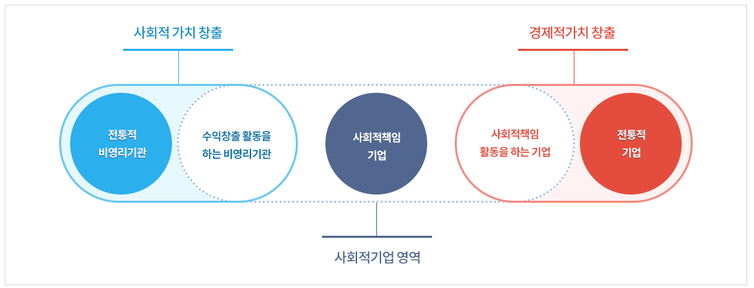 사회적경제는 "공공 목표, 경영 자율성, 민주적 기반의 의사결정, 경영활동을 통해 창출된 이익이 자본보다는 사람과 노동이 중시"라는 윤리적 또는 사회적 원칙을 지키는 조직의 활동을 정의하였다. 사회적경제조직을 사회적 기업, 협동조합, 마을기업, 자활기업 등으로 정부에서 정의하고 있다. 즉, 사회적기업은 영리 기업과 비영리기업의 중간 형태이다. 즉 사회적 목적을 최우선으로 조직을 운영하면서 재화 및 서비스의 생산 및 판매를 통해 영리 활동을 하는 조직으로 정의할 수 있다.