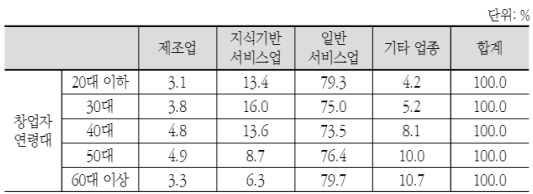 그리고 창업자 연령계층별 창업기업의 업종 분포를 살펴보면 50~60대는 지식기반서비스업의 분포가 감소하고 일반서비스업, 기타 업종이 증가하는 것으로 확인되었다.