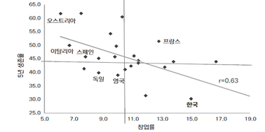 OECD 국가와 우리나라를 포함한 국가별 창업률과 창업기업 5년 생존율 관계(trade off)를 살펴보면 창업률이 높은 국가일수록 창업기업의 5년 생존율은 낮은 것으로 나타났다. 한국은 (창업률, 5년 생존율) 조합이 (15.0%, 30.2%)이고, 한국과 대척점이 있는 오스트리아는 (창업률, 5개 생존율) 조합이 (6.1%, 61.6%)로 나타났다. 어느 국가도 높은 창업률과 창업기업의 높은 생존율을 동시에 달성하지 못하는 상황이다. 이러한 점에서 우리나라처럼 극심한 다산다사형 창업생태계는 기업 창업률을 어느 정도 수준으로 조정하더라도 창업기업의 생존율을 높이는 데 창업정책의 우선순위를 두어야 하며, 이를 위해서는 실패 요인을 억제하고 성공 요인을 활성화하기 위한 정책적 지원이 필요하다(조덕희, 2018)