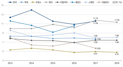 주: 영국, 프랑스, 이탈리아, 스페인 등은 2018년 기준 생존율 자료가 있지만, 우리나라의 2018년 기준 자료가 없어서 2017년 기준 생존율을 살펴봄 자료: 국가통계 포털(kosis.kr) 기업 생멸 행정통계, Eurostat(ec.europa.eu/eurostat/web), Business Demography