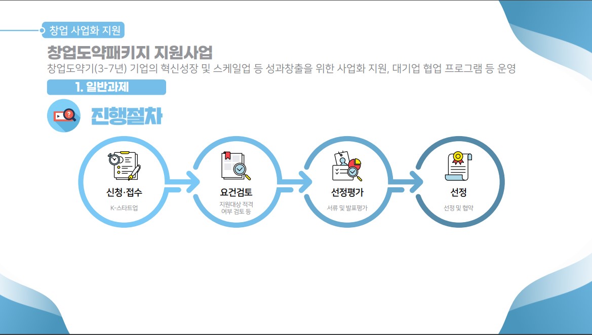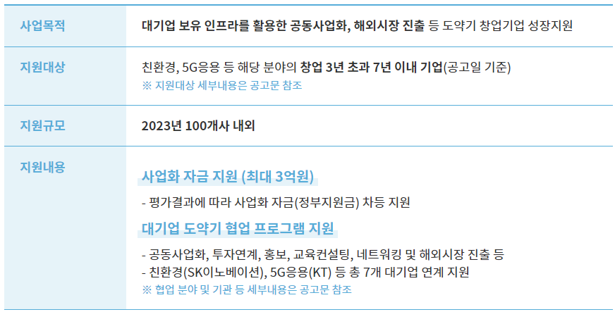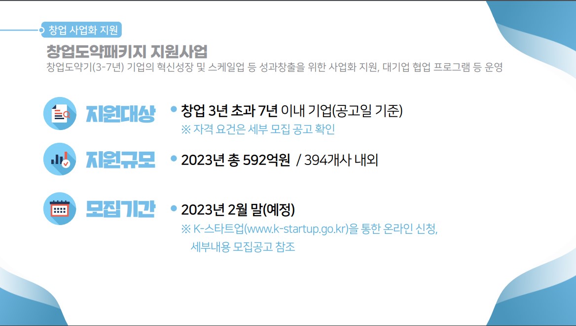 3. 창업도약패키지 지원사업 : 창업도약기(3~7년) 기업의 혁신성장 및 스케일업 등 성과창출을 위한 사업화 지원, 대기업 협업 프로그램 운영을 지원하는 사업입니다.