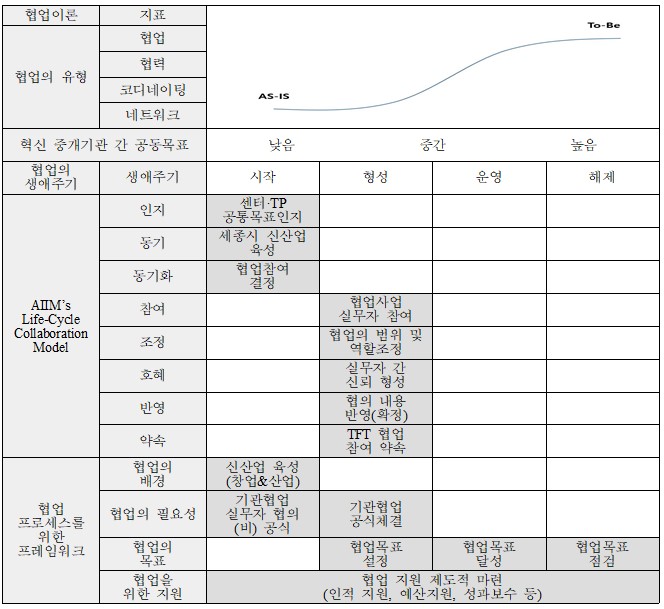 앞서서 제시한 4개 협업이론을 기반으로 윤재만&최종인(2022)은 혁신중개자 간 협업을 체계적으로 운영할 수 있도록 협업프레임워크를 제시하였다.